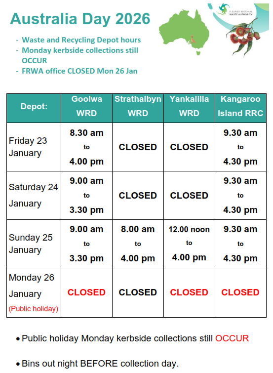 Waste and Recycling Depots and the FRWA office are CLOSED on public holidays (Goolwa, Yankalilla, Kangaroo Island and Strathalbyn).