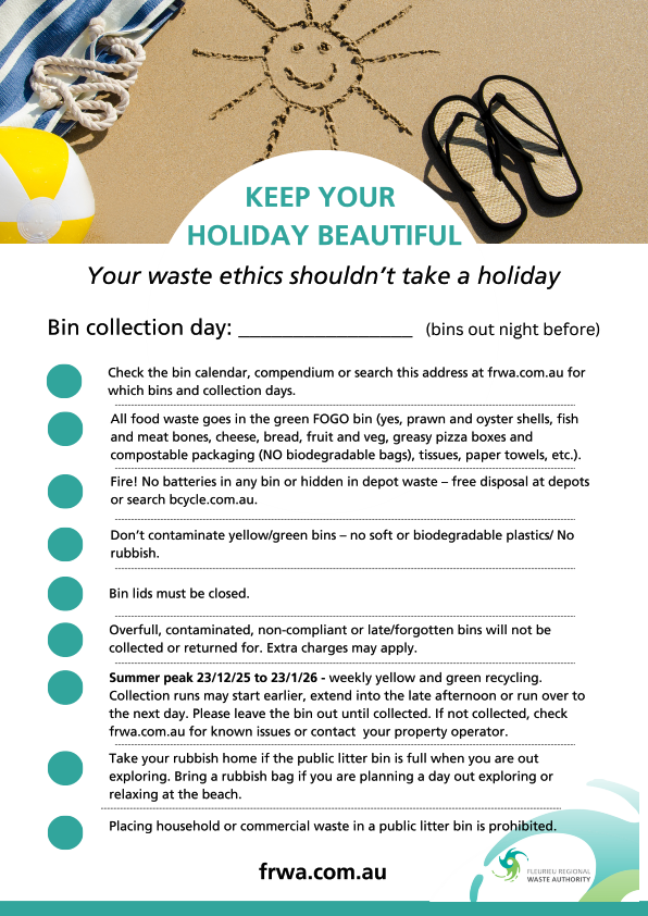 Download the collections calendar or collect printed copies from Council offices or FRWA Depots and display them on the fridge and in the compendium. Don’t forget to write your collection day on the front with a note to put it out the night before, as guests may not be able to find the holiday home on the printed map as easily.