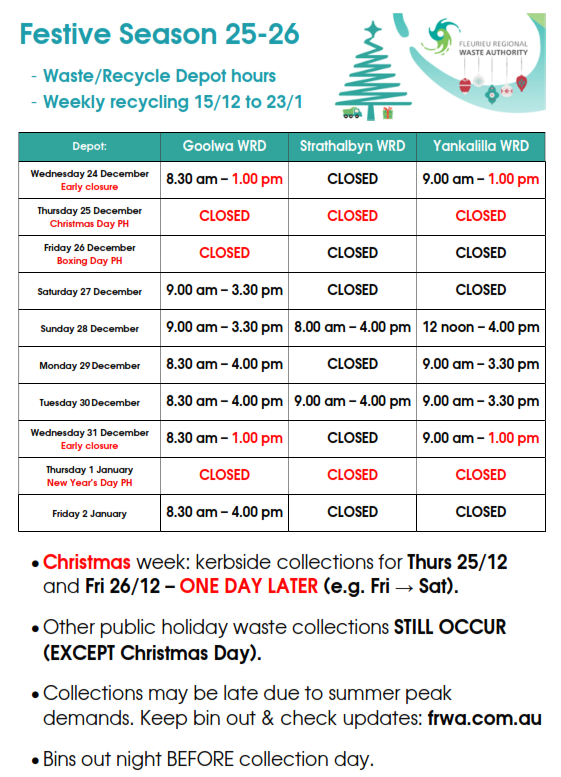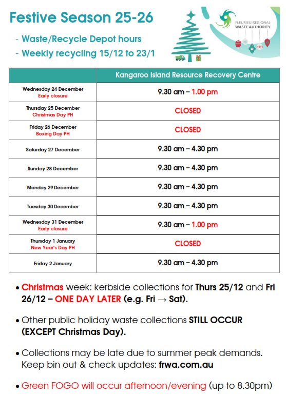The Kangaroo Island, Yankalilla and Goolwa waste depots and office will close early on Christmas and New Year’s Eve (Strathalbyn CLOSED all day):